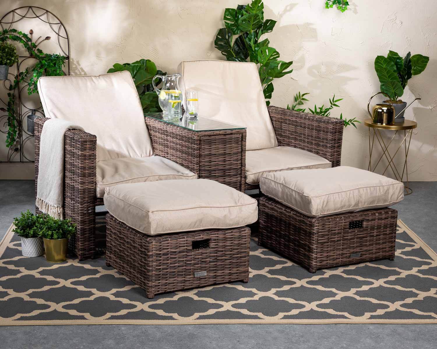 Rattan Garden Sun Lounger Set in Truffle Brown & Champagne – Paris – Rattan Direct Rattan Garden Sun Loungers. Perfect for lying outdoors in your garden in the sun, relax on a rattan garden sun lounger from Rattan Direct. Luxury Rattan Garden Outdoor Patio Furniture, lower prices than White Stores, Maze Living & Moda Furnishings but better quality Features: 2x Sun Lounger Seats. Thick Premium Cushion. Premium Half-Round Weave. Tempered Glass Tabletop. Storage Solution. Arrives fully assembled . Warranty: 7-Year Structural Warranty . Dimensions (cms):. Sun Lounger: W:156 D:76 H:60. Footrest: W:54 D:51 H:27. Affordable Sun Lounger Set. Feast your eyes on this rattan two-seater sun lounger. Featured here in our sort after premium weave, this set has a reclining back for ultimate comfort. Lie back or sit up, on our thick premium champagne cushions. A central table featuring a stunning tempered glass top is the ideal surface to place a drink. The table offers out as a simple storage solution.. Chic Look. Designer sun loungers from us, will look the part in your outdoor space. The two footrests can be tucked neatly beneath the seat, should space become a problem. Raised armrests on the side of the chair for additional support as you bathe in the hot sun. The easy-to-use reclining backrest allows you to lie back for another level of comfort.. Long Lasting Premium Weave. Not only do our rattan weaves come with a warranty, but they€™re also long-lasting. This set in particular is guaranteed to last, as its part of our premium weave collection. The thick half round weave that covers the set is our premium truffle, a popular set for modern homeowners. The natural look will fit effortlessly into your garden. The weave is UV protected whilst the frame has an aluminium powder coating, to prevent the build-up of rust.. Garden Furniture > Rattan Garden Furniture > Rattan Sun Loungers > Rattan Sun Lounger Sets